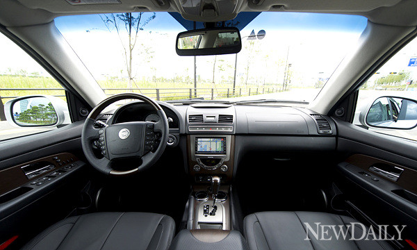 덩치만큼이나 운전석의 높이도 높았다. 기자처럼 키가 ‘짧은’ 사람에게는 사다리를 타는 기분이었다. 운전석에 앉아 시동 버튼을 누르자 백색 라이트의 계기판이 켜졌다. 네비게이션은 아이나비 것을 달고 있었다. 계기판 메뉴는 최근에 출시된 차들과 큰 차이 없었다.