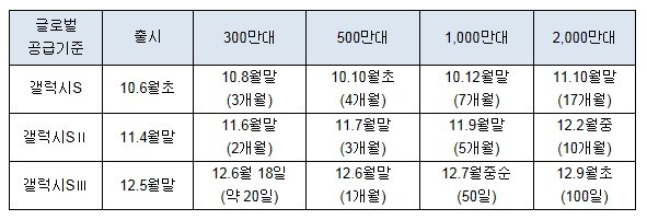 삼성휴대폰 역사상 최단기간인 100일만에 2천만대 돌파 갤럭시S 대비 6배… 갤럭시S2 대비 3배 빠른 판매 속도