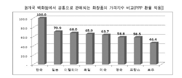 백화점 판매가격은 구매력평가(PPP) 환율을 적용했을 때 한국이 8개국 중 가장 비쌌다.