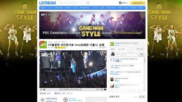 이날 유스트림코리아는 유튜브와 함께 8만 인파가 몰려든 ‘싸이 서울스타일 콘서트’를 공식 온라인 중계했다.