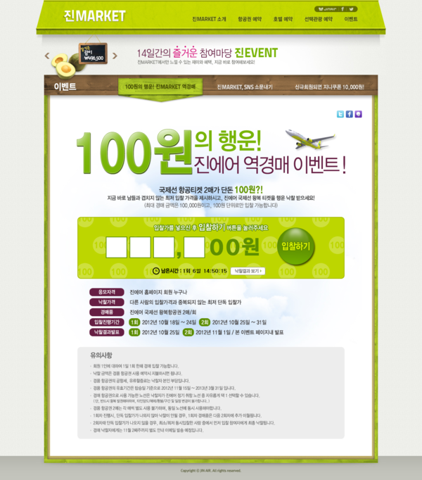 진에어 홈페이지 회원이라면 누구나 최저 100원부터 10만원 사이 금액 중 100원 단위로 입찰가를 제시할 수 있다. 다른 사람의 입찰 가격과 중복되지 않는 단독 최저가 입찰자가 낙찰 받게 된다.