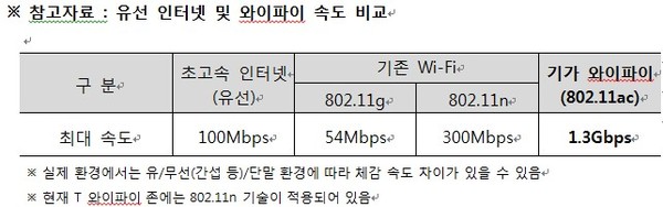 노트북과 PC 등에서 사용되는 802.11n방식(300Mbps)에 비해 약 4배, 스마트폰에서 많이 사용되는 802.11g 방식(54Mbps)보다 약 25배나 빠른 속도이다.
