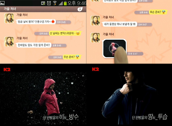 ‘날씨 맞춤형 광고’는 방금 방송된 일기예보를 보고 나서 모바일 메신저를 통해 대화를 나누는 장면으로 시작된다. 대화를 하면서 외출 준비를 하고 오라며 동영상 하나를 보낸다. 동영상 내용은 외출 날씨와 직접 연계된 제품이 나온다.