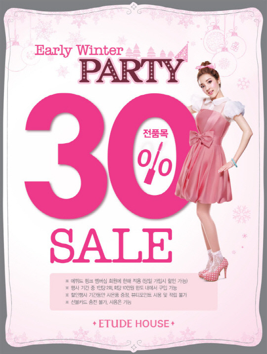 에뛰드하우스는 겨울을 맞아 전 품목을 30% 할인해주는 ‘에뛰드 Early Winter Party, 전 품목 30% 세일’ 행사를 진행한다고 2일 밝혔다.이번 행사는 2일부터 양일간 면세점을 제외한 전국 매장 및 에뛰드하우스 온라인 쇼핑몰에서 동시에 진행된다. 기존 핑크멤버십 회원이 아니더라도 당일 매장에서 신규 가입하면 30% 할인 혜택을 제공한다.“춥고 건조한 겨울이 다가오는 이때 고객들이 더욱 알뜰하게 아름다워질 수 있도록 행사를 마련하게 됐다. 앞으로 더욱 다양한 행사와 프로모션으로 고객에게 보답하겠다”-에뛰드하우스 관계자