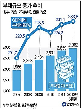 <연합뉴스>는 4일 금융투자업계와 한국은행에 따르면 정부, 기업, 가계의 부채 합계는 6월말 현재 2,962조원으로 명목 국내총생산(GDP)의 233.8%에 달한다고 전했다.