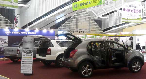 쌍용차는 23일부터 25일까지 인천 송도 컨벤시아에서 열린 ‘2012 인천 관광·레저스포츠 페어(Incheon Tour&Leisure Sports Fair 2012)’에 부스를 마련, 대표 SUV 모델인 렉스턴W, 코란도C, 코란도스포츠를 다양한 레저 용품과 함께 선보였다.