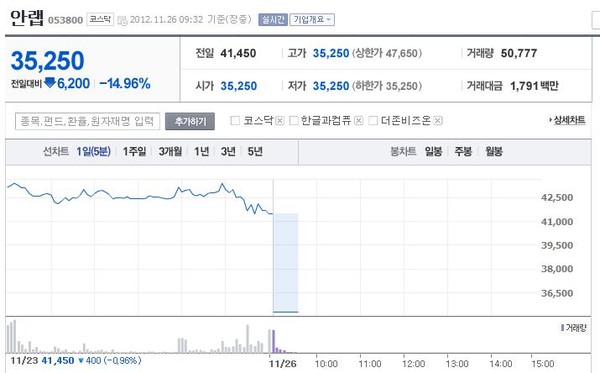 안철수 대선 후보의 전격 사퇴로 안철수연구소(안랩.053800)의 주가가 곤두박질 쳤다.26일 9시30분 현재 안랩의 주가는 하한가인 3만5천250원.개장 초부터 14.96%가 떨어진 가격으로 시작했다.정치 테마주로 안 후보의 대선 성공 가능성을 기대하며 투자했던 세력들이 대거 빠지는 모양새다.현재 하한가 가격에도 54만 가까이 몰려 있는 상태.이에 따라 안랩의 주가는 안 후보가 대선 주자로 거론되기 이전인 1만원대까지 떨어질지도 모른다는 위기감이 형성되고 있다.반대로 문재인 후보의 테마주로 꼽히는 우리들제약은 전거래일 대비 340원(14.81%) 오른 2635원에 거래되고 있다.또 박근혜 테마주로 분류되는 EG 역시 전거래일 대비 1500원(14.71%) 오른 1만1700원에 거래된다.
