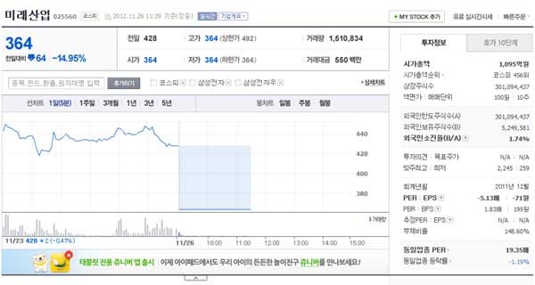 26일 오전 11시를 기준으로 안랩과 써니전자, 미래산업, 솔고바이오, 우성사료, 케이씨피드, 엔피케이 등이 하한가(14.96% ↓)를 기록 중이다.