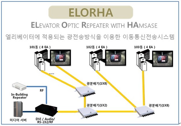 ‘엘로하(ELevator Optic Repeater with HAmsase)’ 기술은 건물 내 지하주차장의 송신기와 엘리베이터 내 중계기 구간을 유선 광케이블로 연결한 것이다.신호를 안정적으로 송수신할 수 있어 엘리베이터 내부에서도 고객들에게 고품질의 3G와 LTE 서비스를 제공하는 기술이다.