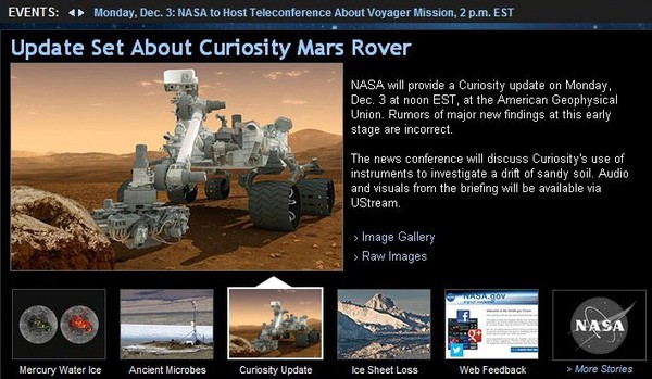 이날 나사가 발표할 내용은 화성 무인탐사로봇 '큐리오시티'가 보내온 '중요한 정보'들인 것으로 알려졌다.