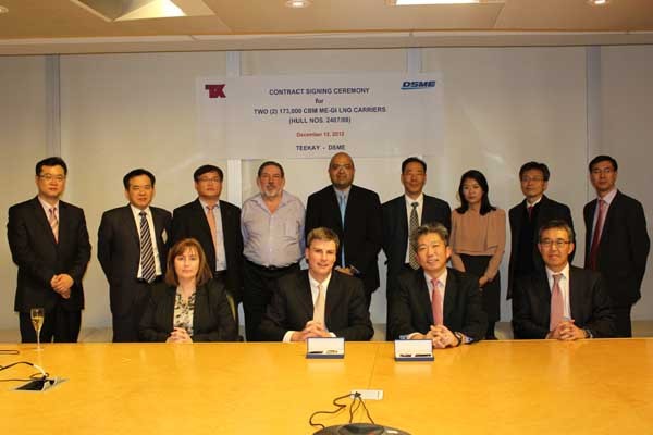 14일 대우조선해양은 캐나다 선사인 티케이(Teekay)社와 17만3천㎥ 급 LNG 운반선 2척 수주 계약을 체결했다고 밝혔다. 수주액은 공개하지 않았고, 모두 옥포조선소에서 건조해 2016년 중순까지 인도할 예정이다. 선사와 대우조선해양은 추가 옵션 3척에도 합의했다.