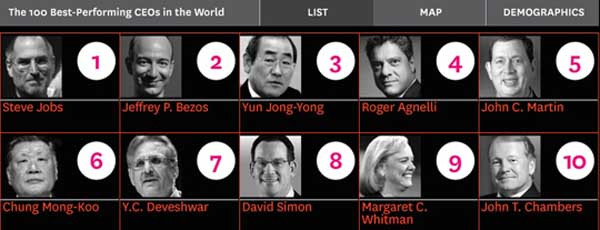 하버드 비즈니스리뷰(HBR)는 지난 20일 "1995년 이후 전·현직 CEO 3,143명을 대상으로 조사한 결과 스티브 잡스 애플 창업자가 최고의 CEO에 올랐다"고 밝혔다.