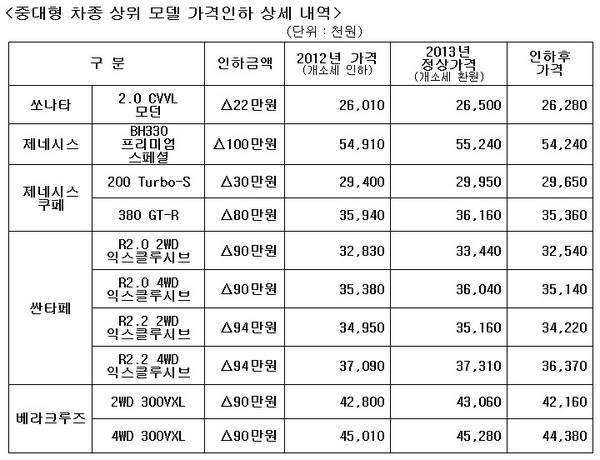 일부 모델들은 개별소비세가 인하된 지난해 가격보다도 24만원에서 73만원 낮은 가격에 구매할 수 있다.(제네시스 3.3 프리미엄 스페셜, 싼타페 2.0/2.2 익스클루시브, 제네시스 쿠페 3.8 GT-R, 베라크루즈 3.0 VXL)