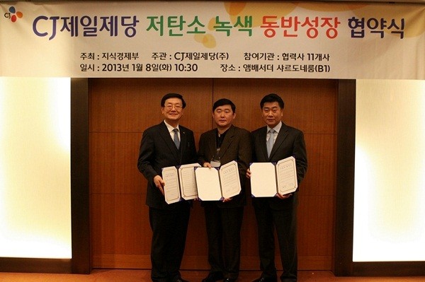 이날 참석한 협력업체는 CJ제일제당의 OEM 생산업체와 포장재 업체 등 11곳이다.그 동안 ‘즐거운 동행’ 브랜드를 통해 지역 중소 식품기업 제품의 전국 유통을 도와 온 CJ제일제당은 지난해에는 기존 상생모델을 업그레이드 시켜 연구개발 단계에서부터 제품 개발을 도와주는 새로운 상생모델을 선보인 바 있다.이번에는 작은 규모의 제조업체들이 미처 실천하기 힘든 탄소 배출 절감을 실질적으로 도와주므로써 녹색경영에서도 동반성장을 실천하는 첫 걸음을 디뎠다.지구온난화에 대응하기 위해 세계 각국은 탄소배출을 줄이기 위한 치열한 노력을 하고 있다.특히 우리나라도 2009년부터 정부가 ‘저탄소 녹색성장’을 국가비전으로 제시함에 따라 에너지 사용량과 탄소배출량을 줄이는 ‘녹색경영’이 제조업에서 꼭 필요한 과제로 자리매김되고 있다.그러나 규모가 작은 중소기업의 경우 관련 노하우와 경험이 부족한 경우가 많아, 대기업이 협력업체에 적극적으로 노하우를 전수해주고 녹색경영 실천을 이끌어주는 것이 필요한 상황이다.이런 차원에서 정부는 각 산업분야의 대표적 대기업을 선정해 녹색경영을 전파할 수 있도록 독려하고 있다.지식경제부가 지난달 초 보고회를 개최한 바 있는 ‘대- 중소 그린파트너십’ 사업이 대표적인 예다.이 파트너십에 CJ제일제당은 식품분야 대표 대기업으로 참여했으며, 8일 열린 협약식은 이 파트너십 사업의 구체적인 향후 계획과 일정을 협력업체에 설명하고 적극 동참을 당부하는 자리라 할 수 있다.CJ제일제당은 그 동안 제조공장에서 버려지는 폐기열을 다시 에너지원으로 활용하고, 낡은 생산공정을 개선하는 등 다양한 방법으로 온실가스를 감축해 지난 한 해에만 2만여톤의 온실가스 배출량을 줄이는 성과를 거둔 바 있다.인천, 부산, 충북 진천 등 전국 각지에 있는 18개 CJ제일제당 공장의 공정 전문가들은 협력업체 에너지 사용현황을 진단하고 온실가스 배출량을 줄이는 데 직접 투입돼 그 간의 노하우를 적극 전수해 줄 예정이다.“CJ제일제당은 당사의 축적된 녹색 경영 역량을 발휘해 협력사에 실질적인 도움이 될 수 있도록 최선을 다할 것이다”“대기업과 협력업체가 식품산업의 저탄소 녹색 동반성장 모델을 함께 마련하고 실행하는 모범사례로 자리매김하게 될 것이다”-CJ제일제당 엄기용 생산총괄 부사장 (협약식에서 발언)