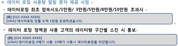 KT는 데이터로밍 최초 접속 시와 1만원, 3만원, 5만원 등 구간에 따라 알림문자를 제공하고 정액권 이용 고객들에게는 무료 데이터량의 구간별 소진시점에 사용량을 문자로 발송한다.