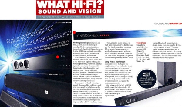 영국의 대표적인 AV전문지 왓 하이파이 1월호 ‘사운드바 대결’ 특집에서 LG ‘사운드바(모델명 NB3520A)’가 최고제품으로 선정됐다.