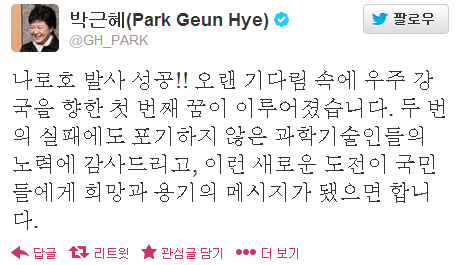박 당선인은 이날 오후 자신의 트위터를 통해 "오랜 기다림 속에 우주 강국을 향한 첫 번째 꿈이 이뤄졌다"고 축하했다.