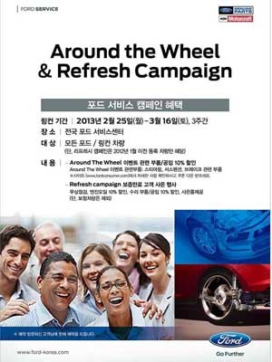 변재현 포드코리아 AS부문 상무의 설명이다.“‘어라운드 더 휠 & 리프레시 캠페인’은 강추위가 기승을 부렸던 겨울을 보낸 고객들이 안전운전을 할 수 있도록 돕기위해 마련했다. 보증이 만료된 고객들께서도 차량을 점검하고, 다가오는 봄에 안전한 주행을 할 수 있기를 바란다.”