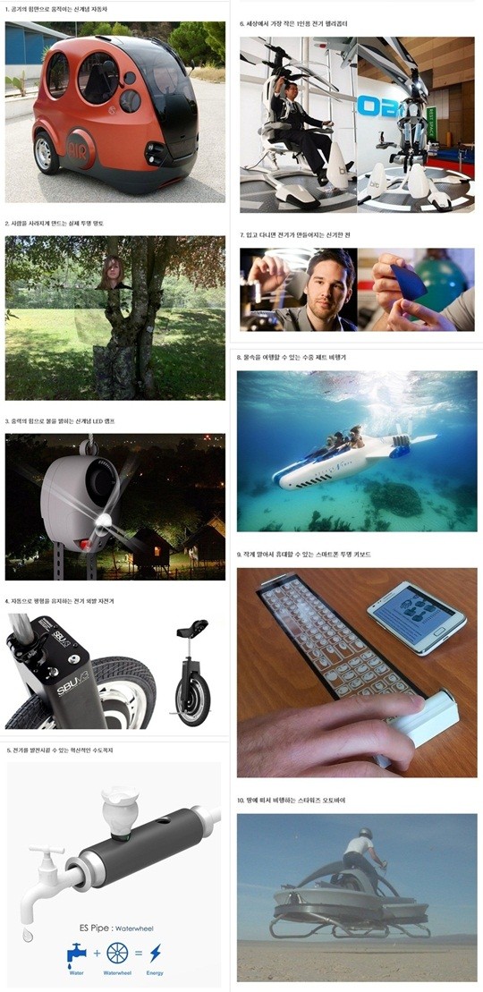 이 외에도 자동으로 평형을 유지하는 전기 외발 자전거, 1인용 전기 헬리콥터, 입고 다니면 전기가 만들어지는 천, 전기를 발전시키는 수도꼭지, 물속을 여행할 수 있는 수중 제트 비행기, 말아서 휴대하는 스마트폰 투명 키보드 등이 포함됐다.