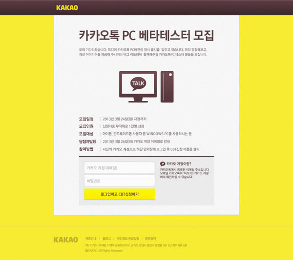 카카오는 20일 카카오톡 PC정식 출시에 앞서 일반 사용자를 대상으로 카카오톡 PC 베타테스터(이하 CBT)를 모집한다고 밝혔다.