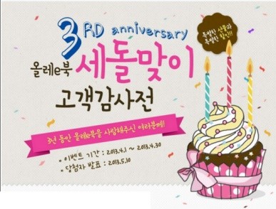 이달 말까지 진행되는 [올레e북 세돌 맞이 고객 감사전] 당첨자는 오는 5월 10일 <올레e북 홈페이지>를 통해 발표될 예정이다.
