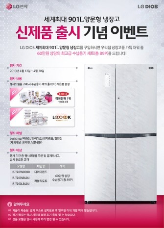 LG전자는 19일 이달 말까지 세계 최대 <901L 양문형 디오스 냉장고>를 구매하는 고객들에게 60만원 상당의 최고급 수납용기 세트를 제공한다고 밝혔다.