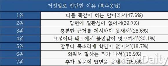 이를 거짓말로 판단한 이유로는 [다들 똑같이 하는 말이라서(47.6%)]를 첫 번째로 꼽았다.