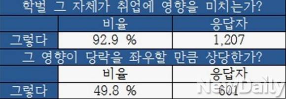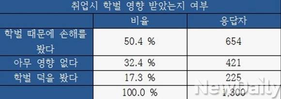 응답자의 50.4%가 [학벌 때문에 손해를 봤다]라고 답했다.
