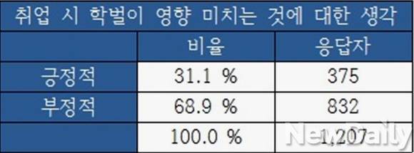 [학벌이 취업에 영향을 미치는 것]에 대해 68.9%가 [부정적]으로 생각하는 것으로 조사되었다.