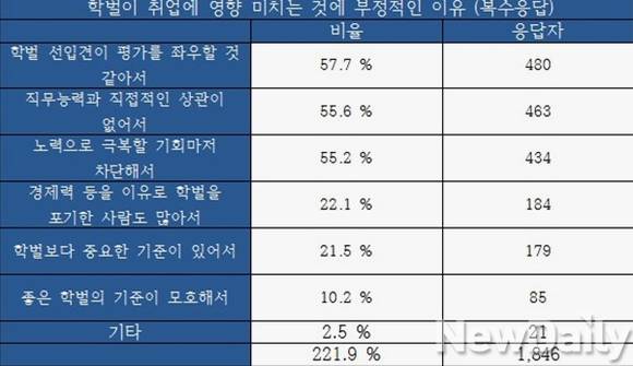 [학벌보다 중요한 기준이 있어서(21.5%)] 등의 순이었다. -