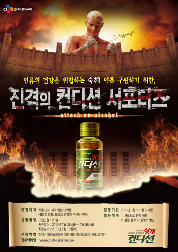 <CJ제일제당>의[헛개 컨디션]은 대학생 마케팅 활동 참여프로그램인[진격의 컨디션 서포터즈]에 참여할 20명을오는 8일까지 공개 모집한다.3일 CJ제일제당에 따르면컨디션 서포터즈는 스스로[컨디션]의 마케터로서 오프라인 아이디어를 제안하고이를 직접 실행해보는 리얼 마케팅 서포터즈 프로그램으로,이름뿐인 서포터즈 활동이 아닌 생생한 실무경험과다양한 문화체험으로 이뤄진 프로그램이다.서울 및 수도권에 거주하는 열정적인 대학생이면 누구나 지원 가능하며,참가 방법은 이름, 연락처, 학교, 사진이 담긴 자기소개서와컨디션 서포터즈가 되고 싶은 이유를이메일(hutgaecondition@gmail.com)로 제출하면 된다.심사를 거쳐 오는 10일 총 20명을 선발하며,두 달간 본격적인 활동을 펼치게 된다.활동 기간 중에는 브랜드 담당자의 멘토링 시간 및온라인 미션 수행 등 실무 경험과 함께멤버들간의 교류도 활발하게 진행 할 예정이다.