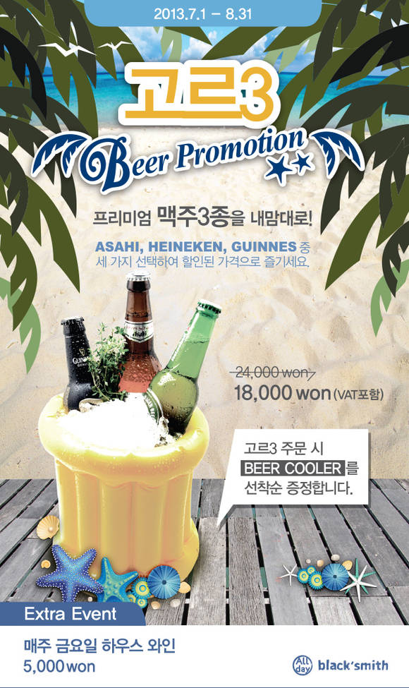 이탈리안 레스토랑 <블랙스미스>에서내달 31일까지 강남역점 등전국50여개의 매장에서 프리미엄 맥주 3종[고르3] 이벤트를 실시한다.이번 이벤트는 국내에서 큰 인기를 누리고 있는아사히, 하이네켄, 기네스3종의 수입맥주 중 3병을 골라 주문하면정상가2만4000원(VAT포함)에서 25% 할인된1만8000원(VAT포함)에 저렴하게 제공하는 이벤트다.이 외에도 매장에서 [고르3] 세트를 주문한고객들을 대상으로 얼음을 채워서 맥주를 담아 두면실온에서도 맥주를 차게 보관할 수 있는 비어 쿨러를선착순으로 증정한다.한편 동시에 시원한 생맥주 프로모션도 함께 진행 중이다.오전 11시 30분부터 밤까지 생맥주 한 잔 주문 시 한 잔 더 제공하는1+1 행사가 진행되며, 생맥주 무제한을 선택할 경우아사히 생맥주(VAT 포함 1만5000원)와 맥스 생맥주(VAT 포함 7500원)가120분간 무제한으로 제공된다.120간 운영시간은 매장에 따라 탄력적으로 운영 중이다.자세한 내용은 블랙스미스 홈페이지를 참고하면 된다.