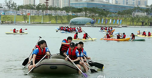 참가자들은 무더위를 뚫고 호수공원에서 딩기요트, 카약, 고무 보트를 타는 체험행사를 가졌다.