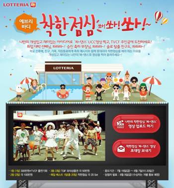 <롯데리아>는 착한점심 UCC 공모전을실시한다고 19일 밝혔다.이번 공모전은최근 반복적인 리듬과 파티 분위기로선풍적인 인기를 끌고 있는롯데리아 TV-CF [착한점심]편의[싸싸싸댄스] 동작을 반영해[우리 00가 쏜다!]라는 주제로UCC영상을 제작하는 형식이다.지인에게 [한턱 쏴]라는 의미를 부여해[쏴쏴쏴] 영상을 창의적으로 제작하는 것이 핵심,롯데리아 페이스북 UCC공모 이벤트 페이지에제작 영상을 게재하면 참가할 수 있다.<롯데리아> [착한점심] UCC 공모전 응모 기준은2인 이상 1팀으로 이루어져야 하며우수 작품에 대해 다음달 7일까지매일 Best 1팀을 선발해착한점심 제품교환권 20장을원하는 곳으로 전달한다.최종 선정된 6팀에게는1등 1팀에 상금 300만원,2등 2팀에 각 100만원,3등 3팀에 각 50만원 상당의TGI프라이데이스 상품권을 증정한다.또한 1등 수상작은8월 중반부터 롯데리아 TV-CF로 방영되는기회가 주어진다.