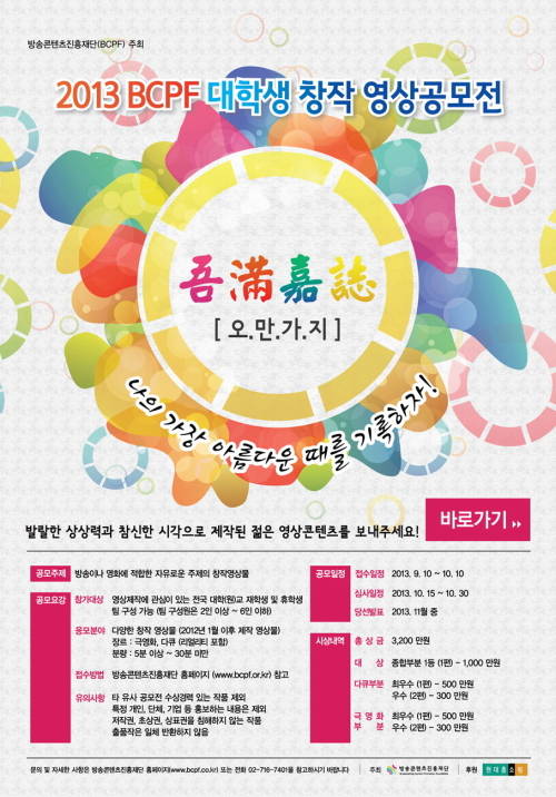 <현대홈쇼핑>은방송콘텐츠진흥재단과 공동으로<현대홈쇼핑>은 방송콘텐츠진흥재단과 공동으로오는 10월 10일까지 대학생 영상 공모전[오만가지(吳滿嘉誌)]를 진행한다고 9일 밝혔다.[오만가지]라는 공모전 타이틀은[나의 가장 아름다운 수많은 모습을 기록하자]라는 의미를 내포하며,다큐, 영화 등 30분 이내의 자유로운 창작 영상물을 제출하면 된다.개인 또는 팀(6인 이하)으로 접수 가능하며접수기간은 9월10일 부터 10월 10일까지 1달동안 진행된다.영상제작에 관심이 있는전국의 대학(원)교 재학생 및 휴학생 누구나 참여 가능하다.대상 1편(1000만원),최우수 2편(각 5000만원),우수 4편(각 300만원) 등총 상금 3200만원을 지원한다.현대홈쇼핑이 올해 처음으로 기획한 이번 영상공모전은대학생들에게 창의적인 영상콘텐츠 제작 기회를 제공하고,참신하고 풍부한 시각으로젊은 영상콘텐츠를 발굴하고자 마련됐다고회사측은 설명했다.
