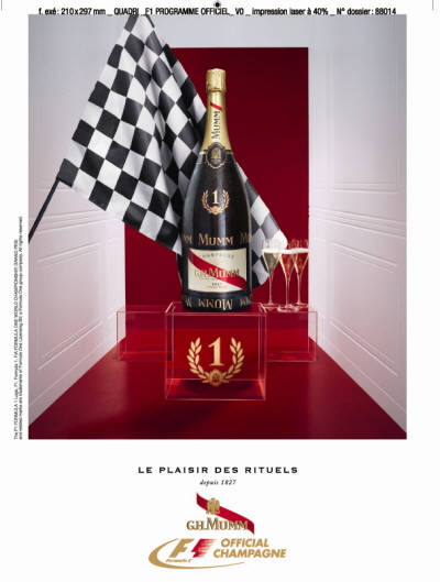 [페르노리카 코리아](대표. 장 마누엘 스프리에)의 샴페인 브랜드 멈(G.H.MUMM)이10월 4일부터 전남 영암에서 열리는 2013년 포뮬러 1코리아 그랑프리 대회(F1)를 기념해구매고객을 대상으로 다양한 이벤트를 벌인다.19일부터 진행되는 이번 프로모션은라운지 바 등에서 멈 1병 주문시 즉석 스크래치카드를 제공해1등 10명에게 F1 티켓(50만원 상당),2등 100명에게 F1 체크깃발 커프스 링크,3등 500명에겐 F1모자를 증정한다.주요 하이퍼 마켓에서 멈을 구입하는 고객 중넥 택에 부착된 스크래치 카드를 통해 당첨된 1,2,3 등에게는F1티켓, 페라리 여행가방, F1모자 등을 총 600명에게 증정한다.포뮬라 1 그랑프리는 유럽,아시아, 북미,남미, 호주 등전세계를 투어하는 초대형 모터스포츠 이벤트로월드컵, 올림픽과 더불어 세계 3대 인기 스포츠로 평가 받고 있다.경기 후 챔피언이 승리를 자축하는 세러머니로 잘 알려진 F1경기는2012년부터 전라남도 영암에서도 개최를 시작한 글로벌 축제다.