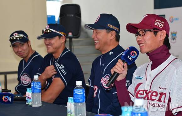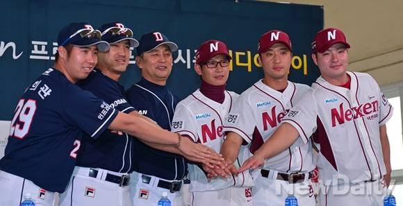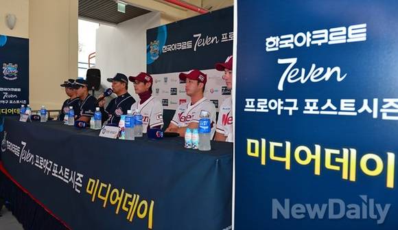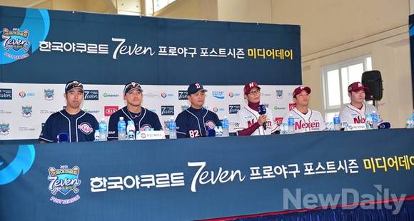 프로야구 준플레이오프 미디어데이가 지난 7일 오후 서울 양천구 목동구장에서 진행됐다.이날 미디어데이에는 넥센 염경엽 감독과 이택근, 박병호 선수두산 김진욱 감독과 홍성흔, 유희관 선수가 참석해 준플레이오프에 대한 포부를 밝혔다.