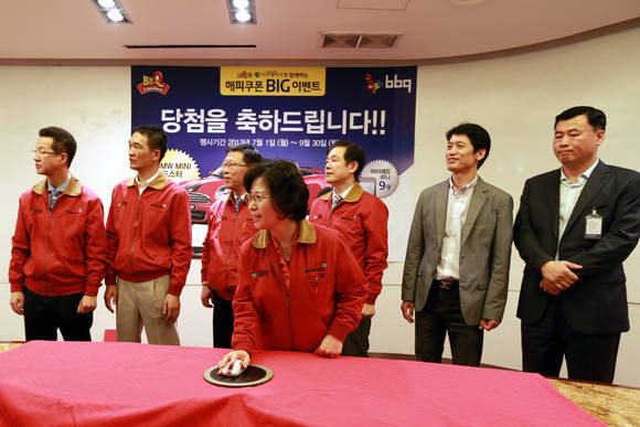 치킨 프랜차이즈 [BBQ]에서 주관한[해피쿠폰 2차 이벤트] 에서BMW 미니 로드스터,아이패드 미니 등총 10명의 행운의 당첨자를 발표했다.지난 10일,송파구 문정동 소재의 제너시스BBQ 그룹 본사에서 진행된 추첨행사에윤경주 BBQ대표를 비롯한 임원들이 참석했으며,행사의 공정성을 위해 송파경찰서 관계자 입회 하에 진행했다.대구 지역의 백모씨가BMW 미니로드스터를 차지했다.BBQ는[해피쿠폰 이벤트]를 통해치킨을 주문하는 모든 고객에게이벤트 응모가 가능한 행운번호를 제공해왔으며,홈페이지에 방문해영수증에 적힌 행운번호를입력한 사람들을 대상으로추첨을 진행했다.뿐만 아니라지난 1일부터 연말까지BBQ의 후라잉유인 올리브유의 우수성을 알리기 위해올리브유 농장 여행이 포함된[스페인 여행권]의 경품을 내 건[해피쿠폰 3차 이벤트]를 진행하고 있다.[사진제공=제너시스 BBQ]