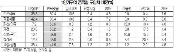 온라인(Online)의 영향력을 한층 더 높일 것으로 예측됐다.1인가구의 품목별 구입처 비중을 조사한 결과