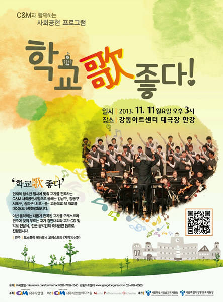 케이블방송사 [씨앤앰]은교가 합창대회 [학교歌좋다] 음악회를 개최한다고1일 밝혔다.[학교歌좋다]는 잊혀져 가는 교가를 되살리기 위해관내 초, 중, 고등학교를 대상으로새로운 교가를 선물하는씨앤앰의 사회공헌 프로그램이다.2010년 구로구 지역 49개 학교를 시작으로,2011년 종로구, 중구, 서대문구, 노원구 28개교,작년에는 마포구 24개교에게 새로운 교가를 전달했다.올해에는 강남구, 강동구, 서초구, 송파구 지역 51개초, 중, 고등학교에 새로운 교가를 만들어줘역대 최다 학교를 지원했다.이와 더불어 씨앤앰은해마다 학생들이 새롭게 바뀐 교가를직접 부르는 [학교歌좋다] 음악회도 함께 진행하고 있다.올해 [학교歌좋다] 음악회는오는 11일 강동아트센터 대극장 한강에서 열리며14개 학교가 경연을 펼칠 예정이다.이날은 팝페라 소프라노 <하나린>,바리톤 <고한승>, 남성 팝페라그룹 <페도라>의 축하공연과교가 CD 및 악보 전달식 등도 함께 열린다.한편, 지역채널 C&M ch1은이날 열리는 [학교歌 좋다] 음악회를오는 23일 오후 4시 1부,오후 5시 2부로 나눠서울과 경기지역에녹화 방송할 예정이다.