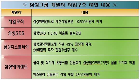 삼성그룹이그룹 지주사 역할을 하고 있는삼성에버랜드를 중심으로조직개편에 불을 붙였다.4일 업계에 따르면삼성그룹은 최근[제일모직의 패션사업부문 삼성에버랜드 양도],[삼성에스디에스(SDS)의 삼성에스엔에스(SNS) 흡수합병]에 이어삼성에버랜드의[급식 및 식자재사업부문(FC)] 등을떼어내 별도 회사를 설립하기로 했다.이들 회사는이재용 삼성전자 부회장,이부진 호텔신라 사장,이서현 제일모직 부사장 등이건희 회장의 세 자녀가지분을 보유하고 있다.삼성에버랜드는이 부회장이 25.10%의 지분을 가진 1대 주주,이 사장과 이 부사장이 각각 8.37%의 지분을 보유 중이다.삼성 SDS 역시개인 주주로는 이 부회장이8.81%의 지분을 차지하고 있으며,이 사장과 이 부사장이각각 4.18%의 지분을 가진개인 2대 주주이다.더욱이삼성SDS가삼성SNS와 합병할 경우이 부회장의 삼성SDS 지분율은더욱 높아진다.업계는 이번 사업구조 개편이당장 오너 일가의 지분 변동은 없지만이서현 제일모직 부사장이 맡을 예정인패션사업에 힘을 실어주는 형태로삼성의 경영권 승계 및 지배구조 개선이나다름 없다고 분석했다.삼성에버랜드는4일 개최된 이사회에서급식 및 식자재사업부문(FC)을 물적분할해[삼성웰스토리(가칭)]라는 식음 전문기업을 신설하고건물관리사업은 에스원에 양도키로 결정했다.삼성의 급식 및 식자재사업부문(FC)는지난 상반기 실적을 기준으로6930억원의 매출액을 달성,삼성에버랜드 전체 매출(1조5304억원)의45%를 차지한 주력사업이다.지난 2011년에는매출액 1조880억원을 기록해전체 매출액의 40.49%를 차지,작년에는 1조2742억원의 수치로 늘리며42.42%로 비중을 키웠다.삼성에버랜드의 급식 및 식자재 부문이 분할한 까닭은제일모직에서 패션사업부문을 인수키로 하면서사업구조를 디자인과 콘텐츠 사업 중심으로재편했기 때문이다.주력사업이 변경되면서사업 연관성이 적은 FC를분리시키기로 한 것이다.더욱이 성장하고 있는 FC를 키우기 위해서는식음 전문기업에 최적화된 조직체계를 구축해시너지를 높이는 등시장 상황에 따라효율성 높은 대응이 필요하다고판단했기 때문이다.이에 따라내달 1일로 신설되는 법인의 지분은삼성에버랜드가 100% 소유하게 된다.현재삼성에버랜드의매출 10% 가량을 차지하는건물관리업은 4800억원에 에스원에 양도키로 했다.주주총회를 거쳐 내년 1월10일까지건물관리사업에 대한 자산과 인력을 모두이관할 전망이다.이에 따라 삼성에스원은건물관리사업까지 양수받게 됐다."제일모직 인수를 계기로 디자인,콘텐츠 사업을 중심으로 사업구조를 재편하는 과정에서연관성이 낮은 사업의 매각과 분할을 추진한 것이다.패션사업 인수와바이오 사업 등 신수종 사업 투자에 따른투자 여력을 확보하기 위한 목적도 있다."- 삼성그룹 관계자이와 관련업계 한 관계자는이 같이 풀이했다.