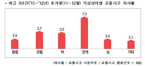 안개가 낀날 발생한 교통사고 치사율은 7.3%를 기록, 가장 높았다. -