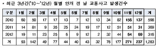 안개로 교통사고가 가장 많이 발생하는 때는 11월로 나타났다.