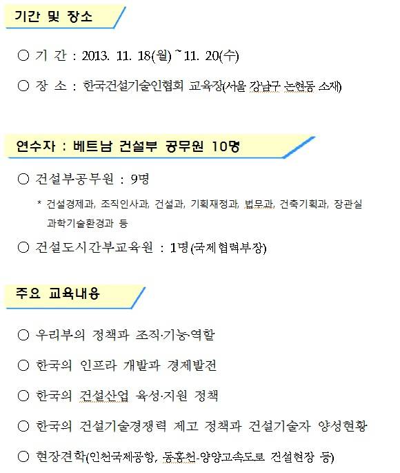 2차례의 국내 연수를 실시하는 등 활발히 교류하고 있다."이번 교육을 통해우리나라 건설업체들의 베트남 진출이보다 확대될 수 있는 계기가 될 것으로 기대한다."- 개발원 관계자 -