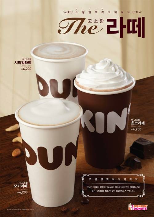 던킨도너츠는겨울 시즌을 맞아[더 고소한 라떼] 시리즈3종을 출시한다고 20일 밝혔다.더 고소한 라떼는프랄린 시럽이 들어가고소한 맛이 배가 된겨울 시즌 한정 프리미엄 제품이다.프랄린은아몬드와 헤이즐넛을끓는 설탕물에 빠뜨린 것에서 유래한 것으로견과류를 곱게 갈아다크나 밀크 초콜릿으로 코팅해달달하고 고소하다.이번 시리즈 음료는[더 고소한 모카라떼],[더 고소한 초코라떼],[더 고소한 시리얼라떼] 등3종으로 구성됐다.가격은 각각 4,200원이다.