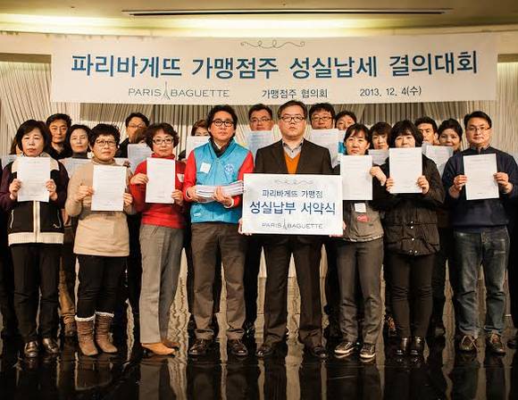 파리크라상의 대표브랜드파리바게뜨의 가맹점주들이4일 삼성동에서 [성실납부 서약식]을 가졌다.최근 프랜차이즈 가맹점에 대한부가세 추가 과세 논란이 일고 있는 가운데 열린이번 서약식에서 파리바게뜨 가맹점주들은성실히 납세 의무를 지켜나갈 것을 약속하고[성실납부 서약서] 1,000여개를 국세청에 전달했다."최근 불황과 각종 규제로프랜차이즈 자영업자들의 경영 여건이 계속 악화되고 있는 가운데,예상치 못한 과세까지 이루어진다고 하니 눈앞이 캄캄하다.POS 기록이 실제 매출과 다른 부분이 있고,POS 매출로 과세하는 것을 몰랐던 만큼국세청이 계도 기간을 주길 바란다."- 대전광역시 파리바게뜨 운영 중인 가맹점주 김필환(52)씨한편서약식에는 파리바게뜨 가맹본부에서도주요 임직원들이 참석해 가맹점의 의견을 경청하고상생을 위한 다양한 논의를 진행했다."이번 부가세 추가 과세 문제와 관련해본부 차원의 지원을 아끼지 않을 것이며,가맹점 피해가 최소화될 수 있도록 최선을 다하겠다."- 파리바게뜨 본사 관계자