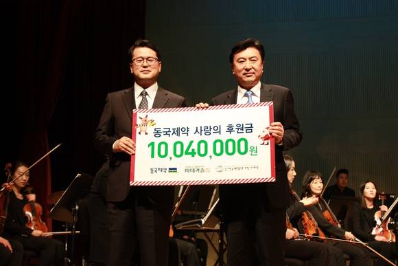 동국제약(대표이사 이영욱)은지난 16일 서울 충정로 NH아트홀에서한국백혈병어린이재단과 함께[제5회 사랑의 송년음악회]를 개최했다.이 음악회는동국제약이 2009년부터매년 한국백혈병어린이재단에소아암 어린이들을 위한 후원금을 전달하고,음악을 통해 따뜻한 사랑을실천하기 위해 개최되는 자선행사이다.올해도 전과 같이1004만원을 이영욱 대표가백혈병어린이재단 서선원 사무국장에게 전달했다.NH아트홀 로비에서는[소아암 어린이들에게 보내는 응원의 메시지]를 적어크리스마스트리에 장식을 하는 행사도 진행됐다.이날 공연은서희태 지휘자와밀레니엄심포니 오케스트라가 호흡을 맞춰정통 클래식뿐만 아니라영화음악과 크리스마스 캐롤 등을연주했다.코리아주니어 빅밴드도 출연해신나는 무대를 선사했다.[사진설명= 동국제약이 제5회 사랑의 송년음악회에서 소아암어린이들을 위한 후원금을 전달하고 있다. 동국제약 이영욱 대표<오른쪽>, 한국백혈병어린이재단 서선원 사무국장<왼쪽>]