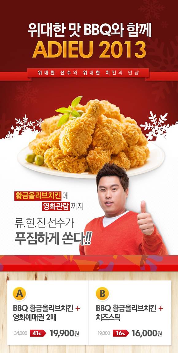치킨 프랜차이즈 BBQ가오는 20일부터 티켓몬스터와 손잡고할인 행사를 진행한다고 19일 밝혔다.소셜커머스 티켓몬스터에서는[BBQ 황금올리브치킨 + 영화예매권 2매]를 1만9900원에,[BBQ 황금올리브치킨 + 치즈스틱]을 1만6000원에판매할 예정이다.각각 41%, 16% 할인된 가격이다.티켓몬스터 홈페이지를 통해 상품을 구매 하고,발송되는 SMS 티켓번호를 이용해BBQ홈페이지와 CGV Cinema 홈페이지에서온라인 배달 주문 및 영화예매가 가능하다.BBQ는전 가맹점에서 배달 주문이 가능하며,영화는 CGV, 메가박스, 롯데시네마 등전국 주요 영화관에서 예매가 가능하다.자세한 사항은각 홈페이지를 통해확인해 볼 수 있다.이 상품은오는 26일까지 구매 가능하며,쿠폰의 유효기간은내년 1월 26일까지다."지난 한 해 동안 BBQ를 사랑해준 고객들에게감사의 마음을 전하기 위해 티켓몬스터와 손을 잡고연말 특별 이벤트를 기획했다.티켓몬스터 홈페이지를 통해이 상품을 구매하고 BBQ 치킨과 함께영화감상을 즐기길 바란다."- 이용준 마케팅팀 상무