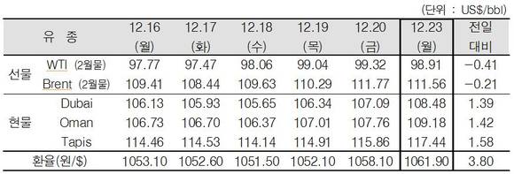 전 거래일 대비 배럴당 0.41달러 내린 [98.91달러]를 기록했다.