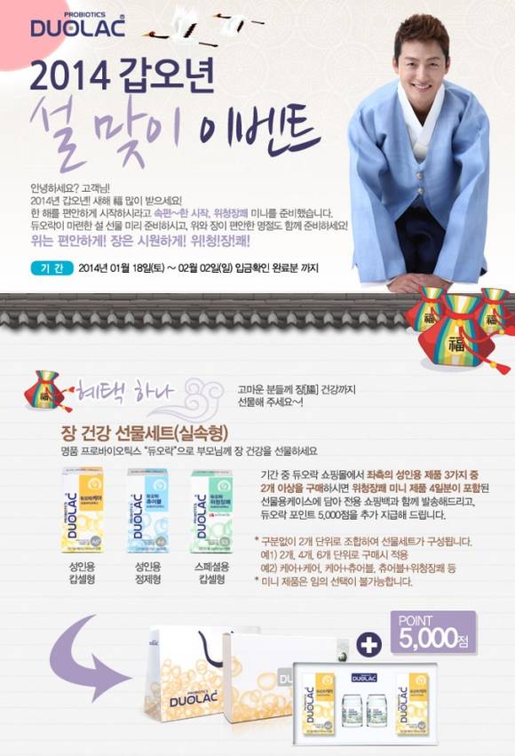 쎌바이오텍(대표 정명준)은오는 29일까지 민족 최대의 명절 설을 앞두고[듀오락 2014 갑오년 설 맞이 이벤트]를자사 쇼핑몰 [듀오락몰(www.duolac.co.kr)]에서 진행한다.이번 [듀오락 2014 갑오년 설 맞이 이벤트]에서는성인용 스테디셀러 제품인[듀오락 골드]와 [듀오락 혈당컨트롤]을선물세트로 출시하면서듀오락 제품을 직접 선택해맞춤형 선물세트를 구성하는 이벤트를함께 실시한다.특히듀오락 맞춤형 선물세트는고함량 프로바이오틱스 유산균이 함유된[듀오락 케어],간편하게 씹어먹는 [듀오락 츄어블],위와 장을 동시에 관리하는 [듀오락 위청장쾌] 등성인용 제품 총 3종 가운데2가지를 골라 선물세트로 구성할 수 있다.이를 통해선물 받는 사람의 연령, 증상, 체질 등을 고려해감사 의미를 더한 맞춤형 선물세트를 준비할 수 있다.이와 함께 쎌바이오텍은세트를 구매하는 모든 고객에게듀오락 위청장쾌 미니 제품(2일분) 2개를추가 증정하는 등다양한 혜택을 마련했다.또한 성인용 제품을 세트로 구매하는 고객에게는설 선물 전용 포장서비스를 지원하며각 세트를 구매하는 듀오락 회원에게는특별 포인트를 적립해 제품구매 시포인트를 사용해 원하는 미니제품을구매할 수 있게 해준다."설을 맞아주는 이와 받는 이 모두 만족할 수 있도록본 이벤트를 기획하게 됐다.듀오락 설 선물세트는최근 건강 트렌드에 발맞춰고마운 이들의 건강까지 생각한다는 의미를 담았다."- 쎌바이오텍 정현석 경영기획실 실장